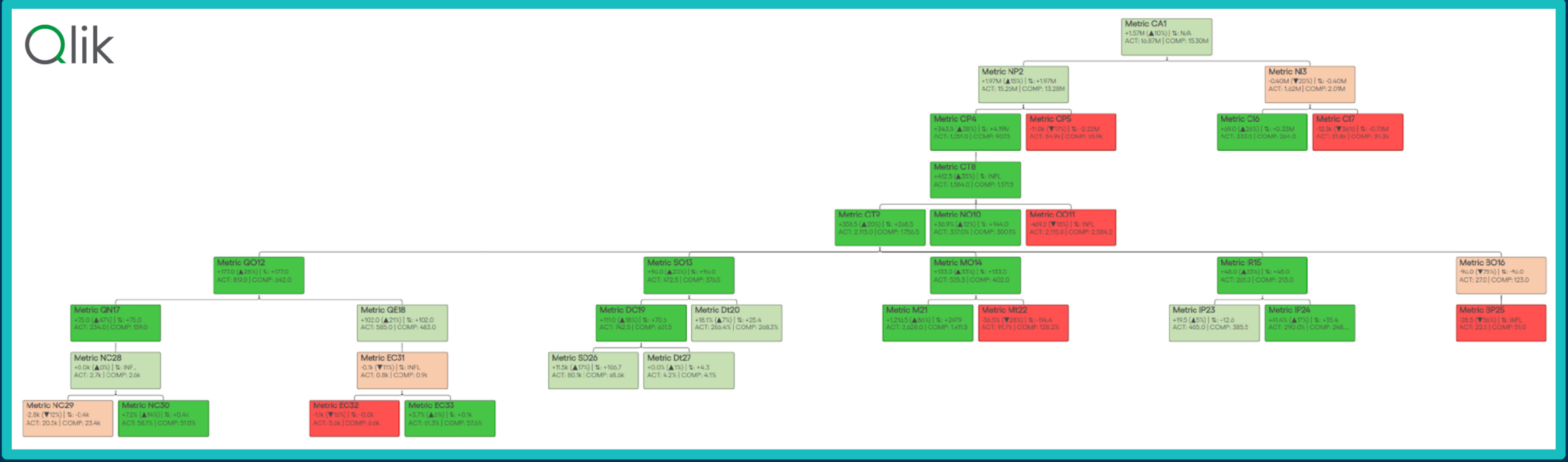 Sergey: What you see here just a screenshot, but the real tree is is automated and built in Qlik. You can interact with it, zoom in and out, and drill into specific branches. The colors represent how individual metrics are performing against whatever comparison you choose. It could be an average, last year same period, things like that.